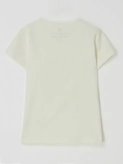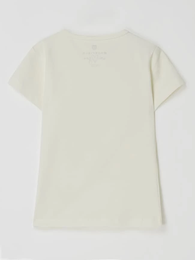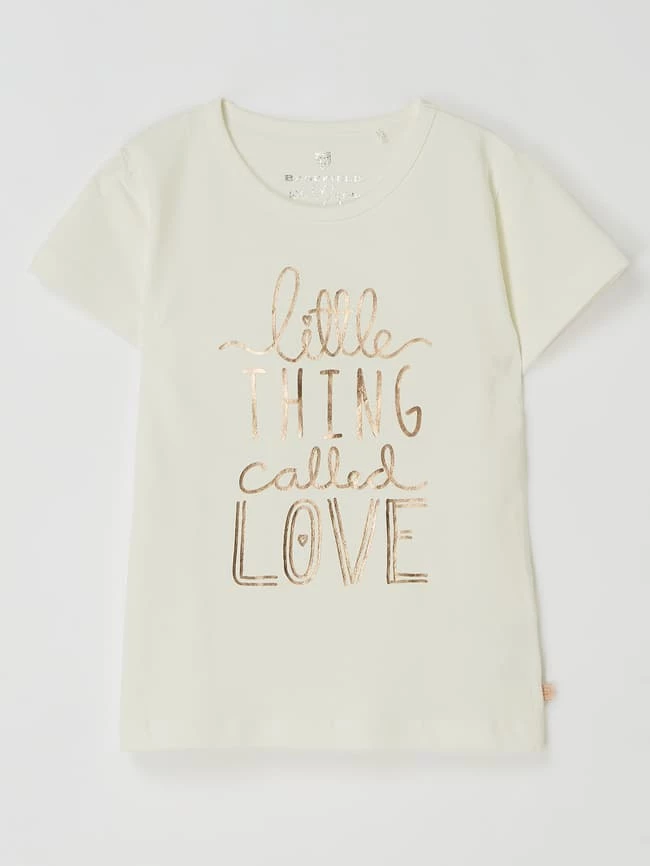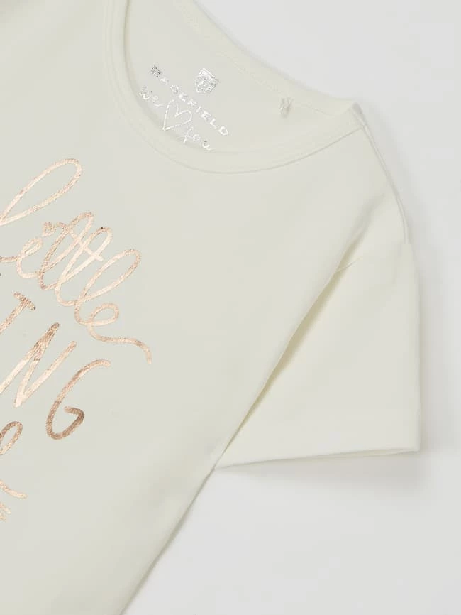 Das T-Shirt von BASEFIELD ist aus einem Baumwoll-Elasthan-Mix gefertigt. Es kommt in gerader Passform mit Rundhalsausschnitt und Message in Metallic-Optik.