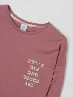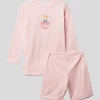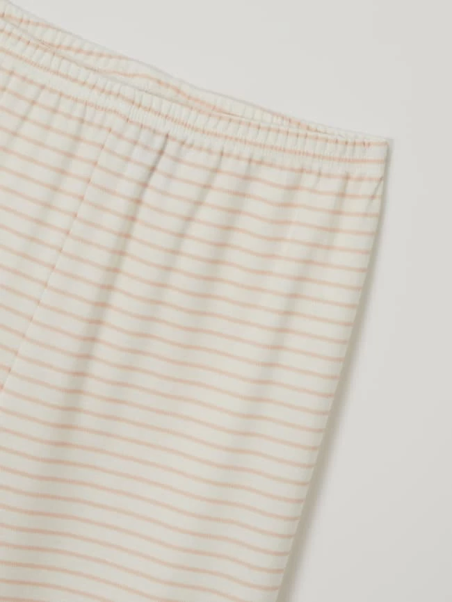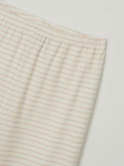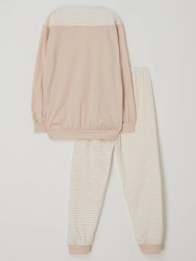 Der Pyjama von CALIDA ist aus Bio-Baumwolle gefertigt und gerade geschnitten. Das Oberteil kommt mit V-Ausschnitt, Kontrasteinsatz und gerippten Abschlüssen. Die Hose zeigt sich mit Streifenmuster und elastischem Bund.