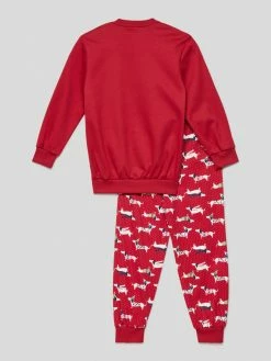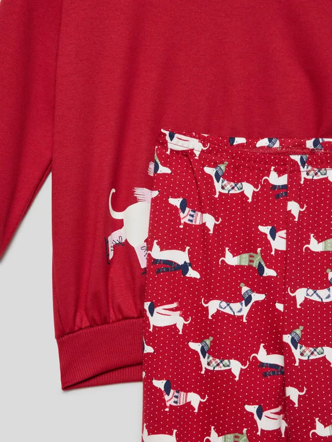 Der Pyjama von Calida ist aus strapazierfähigem Material gefertigt und gerade geschnitten. Das Oberteil kommt mit Motiv-Print. Die Hose zeigt sich mit Allover-Muster.