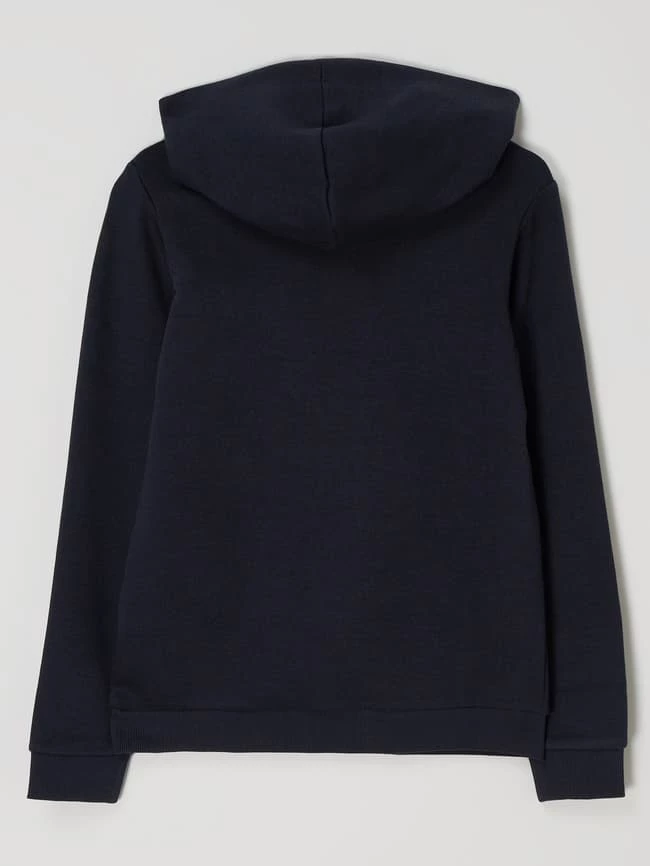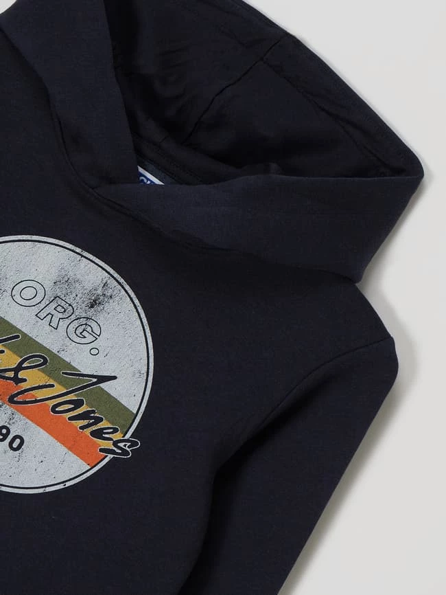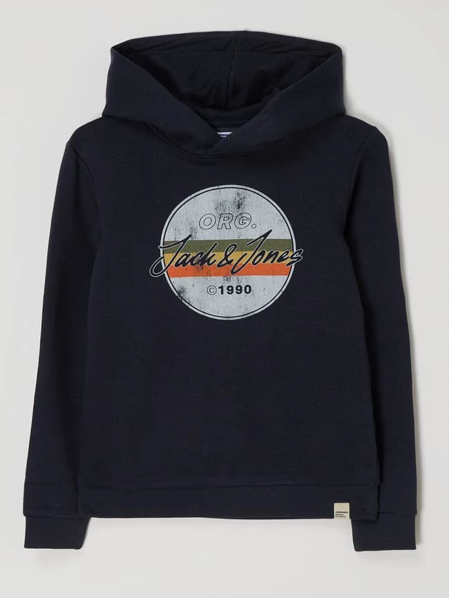 Der Hoodie von JACK & JONES ist aus einer Baumwollmischung gefertigt und gerade geschnitten. Er zeigt sich mit Kapuze, Logo-Print und gerippten Abschlüssen.