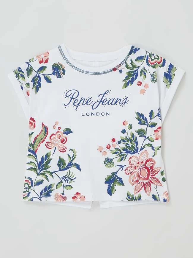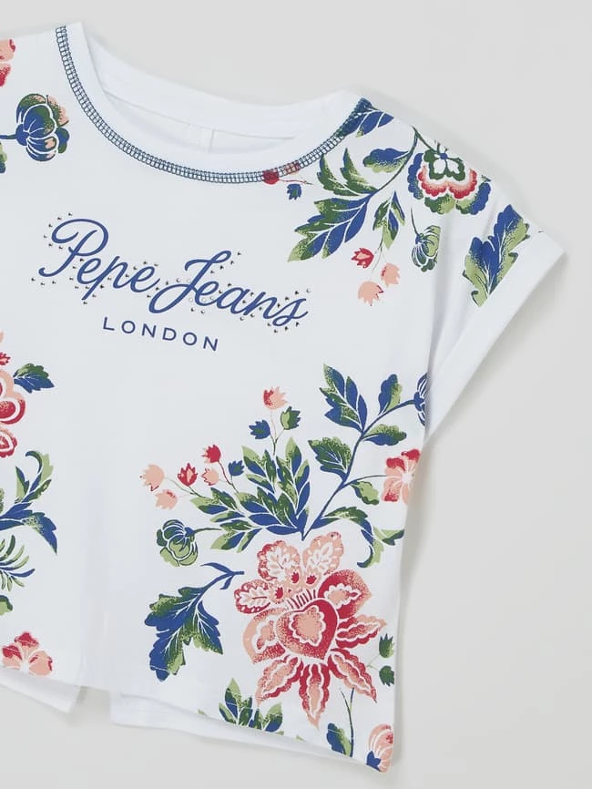 Das T-Shirt von Pepe Jeans ist aus reiner Baumwolle gefertigt und im Boxy Fit gehalten. Es zeigt sich mit floralem Muster, angeschnittenen Ärmeln und Strasssteinen.