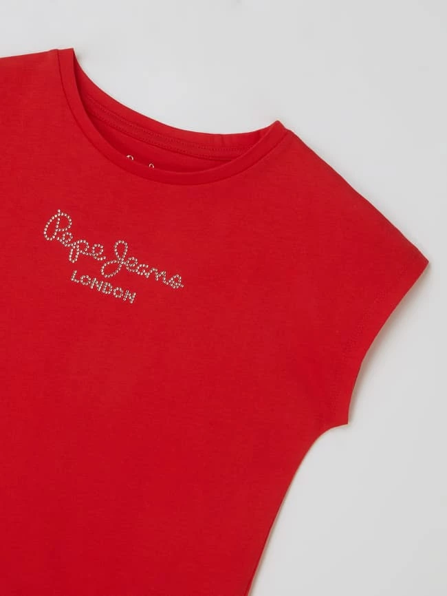 Das T-Shirt von Pepe Jeans ist aus reiner Baumwolle gefertigt und locker geschnitten. Es kommt mit Rundhalsausschnitt, angeschnittenen Ärmeln und Strasssteinen.