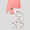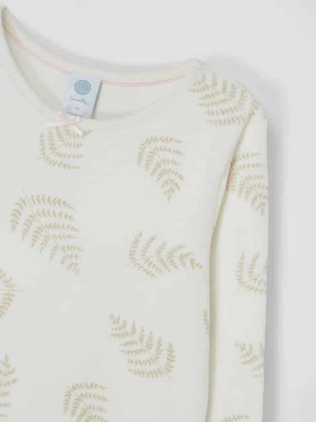 Der Pyjama von Sanetta ist aus einer Baumwollmischung gefertigt und locker geschnitten. Das Oberteil zeigt sich mit Rundhalsausschnitt und Zierschleife. Die Hose kommt mit elastischem Bund und abgesetzten Beinabschlüssen.